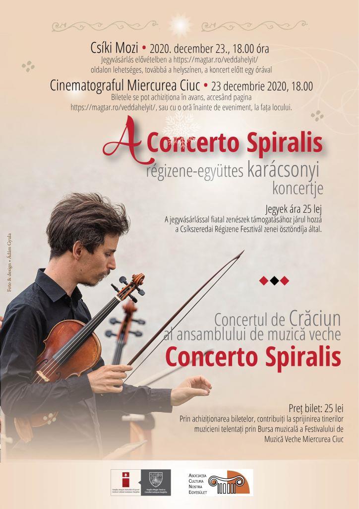 December 23-án, szerdán 18 órától lesz a Concerto Spiralis együttes koncertje a Csíki Mozi nagytermében és december 19-én volt, szombaton 18 órától a Codex régizene-együttes műsora amely visszanézhető a www.facebook/kkozpont.ro oldalon,