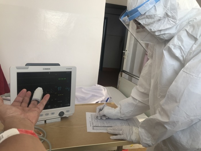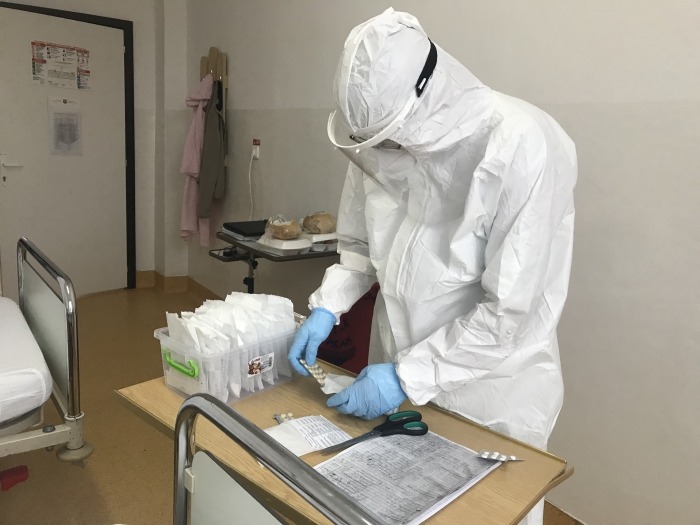 Első látásra, a tetőtől talpig fehér műanyag védőruhába öltözött kórházi alkalmazottak látványa furcsa, már-már ijesztő volt, mintha valami űrlények költöztek volna a kórterembe. Ám hamar rá kellett jönnünk: ez itt a minimális védekezés, de korántsem zárja ki a fertőződés lehetőségét. Az itt dolgozók családjai is folyamatos veszélynek vannak kitéve, az óvintézkedések betartása nem lehet kérdés.