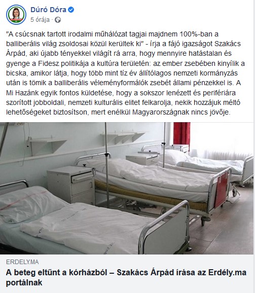 Dúró Dóra, a Mi Hazánk Mozgalom országgyűlési képviselője közösségi oldalán reagált az Erdély.ma portálon megjelent írásra. Mint fogalmazott: "A csúcsnak tartott irodalmi műhálózat tagjai majdnem 100%-ban a balliberális világ zsoldosai közül kerültek ki" – írja a fájó igazságot Szakács Árpád, aki újabb tényekkel világít rá arra, hogy mennyire hatástalan és gyenge a Fidesz politikája a kultúra területén: az ember zsebében kinyílik a bicska, amikor látja, hogy több mint tíz év állítólagos nemzeti kormányzás után is tömik a balliberális véleményformálók zsebét állami pénzekkel is. A Mi Hazánk egyik fontos küldetése, hogy a sokszor lenézett és perifériára szorított jobboldali, nemzeti kulturális elitet felkarolja, nekik hozzájuk méltó lehetőségeket biztosítson, mert enélkül Magyarországnak nincs jövője.